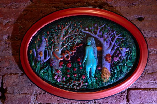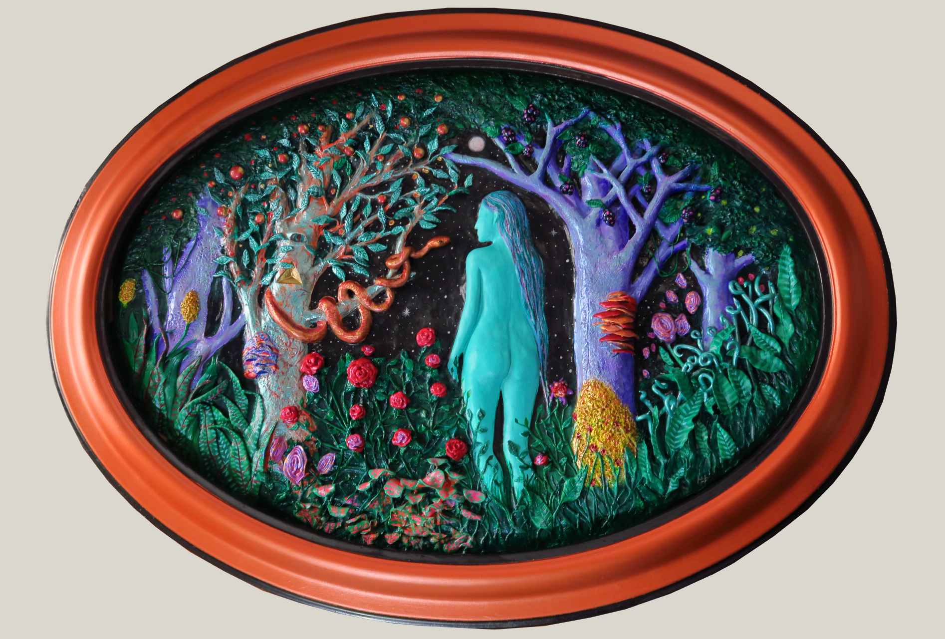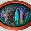 Sobre relieve de arcilla polimérica y acrílicos. Enmarcado en vidrio convexo.